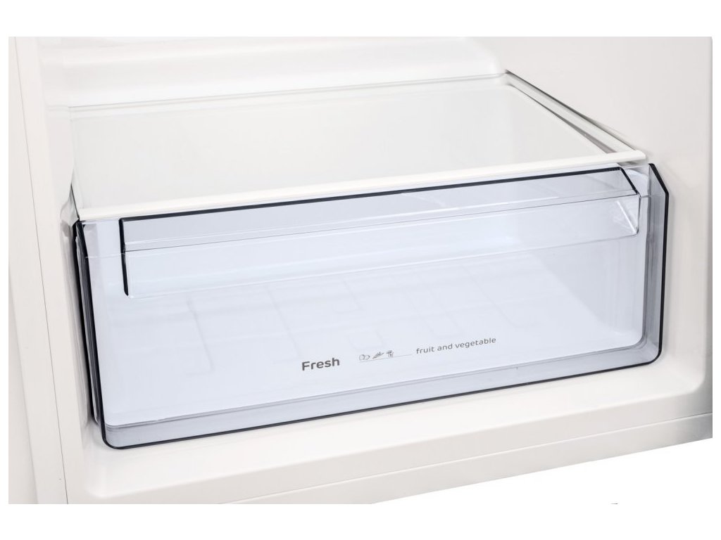Chladiaca časť s objemom 169 l je rozdelená pomocou 4 sklenených políc av spodnej časti sa nachádza transparentný box na ovocie a zeleninu.