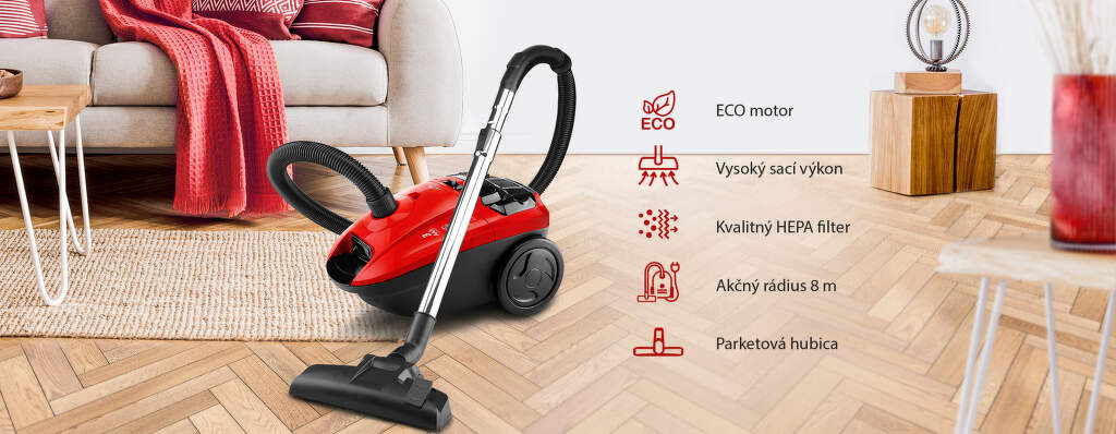 Červený vreckový podlahový vysávač ETA Diego má úsporný Eco motor (príkon 800 W), ktorý šetrí nielen životné prostredie, ale aj vaše peniaze. Vysoký sací výkon však zostáva zachovaný. Vďaka elektronickému ovládaniu ho môžete prispôsobiť svojim potrebám.