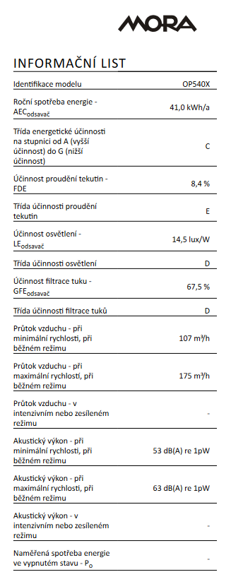 Podvesný odsávač MORA OP 540 X v šírke 50 cm v nerezovom prevedení je určený pre inštaláciu pod skrinku, ale môže byť nainštalovaný aj bez nej. Vďaka 6 odťahom cez stenu a možnosti recirkulácie je ideálnym riešením do panelákových kuchýň. 3-rýchlostné tlačidlové ovládanie s výkonom až 178 m3/h a hlučnosťou 63 dB spoľahlivo odstráni nepríjemné pachy a mastnotu. LED osvetlenie je samozrejmosťou. Odsávač je vybavený prednou sklenenou nábehovou lištou, ktorá pomáha zadržať paru. kovové filtre proti mastnote môžete umývať v umývačke a pri dokúpení uhlíkových filtrov možno odsávač prevádzkovať aj na recirkuláciu.