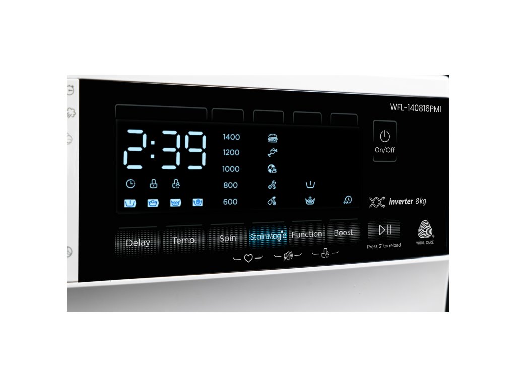 Prací program „Steam Hygiene“ zaisťuje sterilizáciu bavlneného oblečenia pomocou horúcej pary a robí oblečenie sviežim a sterilne čistým. Ovládací panel práčky WFL-140816PMI s centrálne umiestneným otočným gombíkom na výber programov pomáha spustiť proces prania len v troch jednoduchých krokoch.