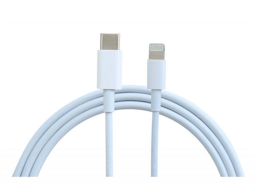 Dátový a nabíjací kábel pre Apple iPhone, iPad a iné zariadenia s Lightning konektorom, USB Hi-Speed 480 Mb/s, nabíjanie až 1,5 A, 1x USB-C, 1x Lightning konektor, farba biela, dĺžka 2 metre.