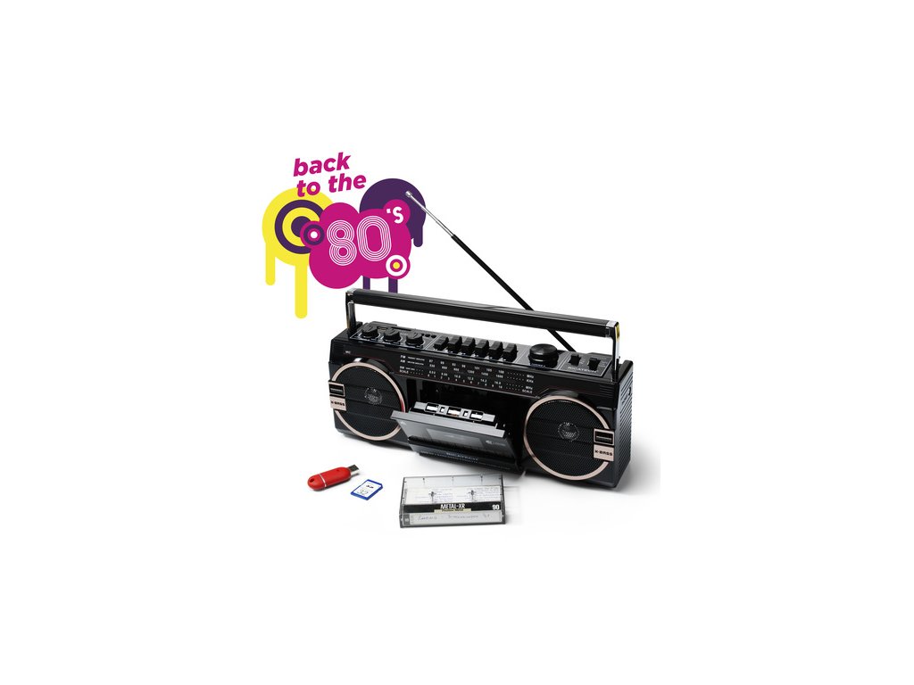 Prenosný kazetový prehrávač Ricatech PR1980 Ghettoblaster Vás zavedie späť do osemdesiatych rokov. Bezkonkurenčný retro dizajn skrýva dnešnú technológiu. Je ideálnou voľbou pre tých, ktorí oceňujú nápaditý vzhľad z minulosti, ale tiež využívajú možnosti modernej technológie.