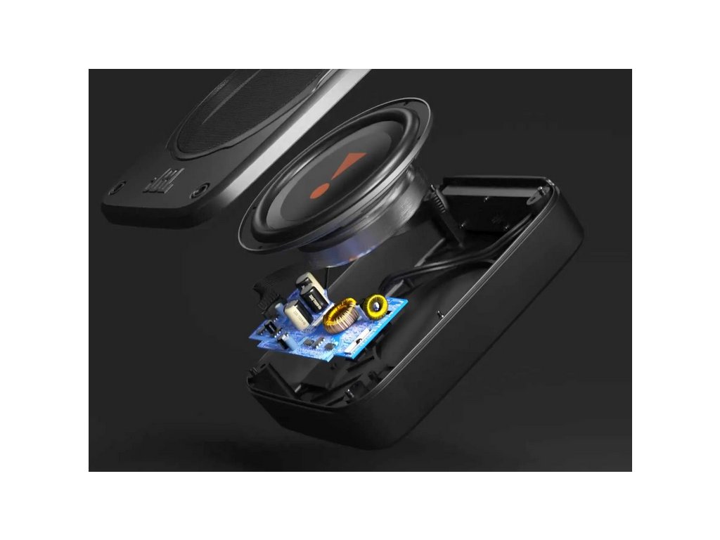 Celý dizajn krytu z tlakovo liateho hliníka má nielen ultra-kompaktnú veľkosť, ale „ALL IN ONE (Všetko v jednom)“ je kombináciou elegantného priemyselného dizajnového prvku JBL a silného akustického výkonu.
