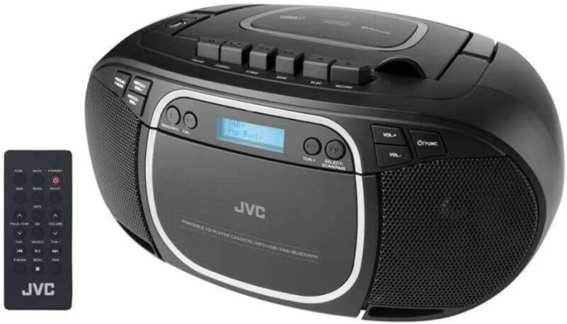 Prenosný rádiomagnetofón JVC RC-E561B-DAB v čiernej farbe sa pýši CD a kazetovým prehrávačom, technológiou Bluetooth 5.0, FM a DAB+ rádiom, USB a Aux-In vstupom, LCD displejom či RMS výkonom 2× 1,5 W.