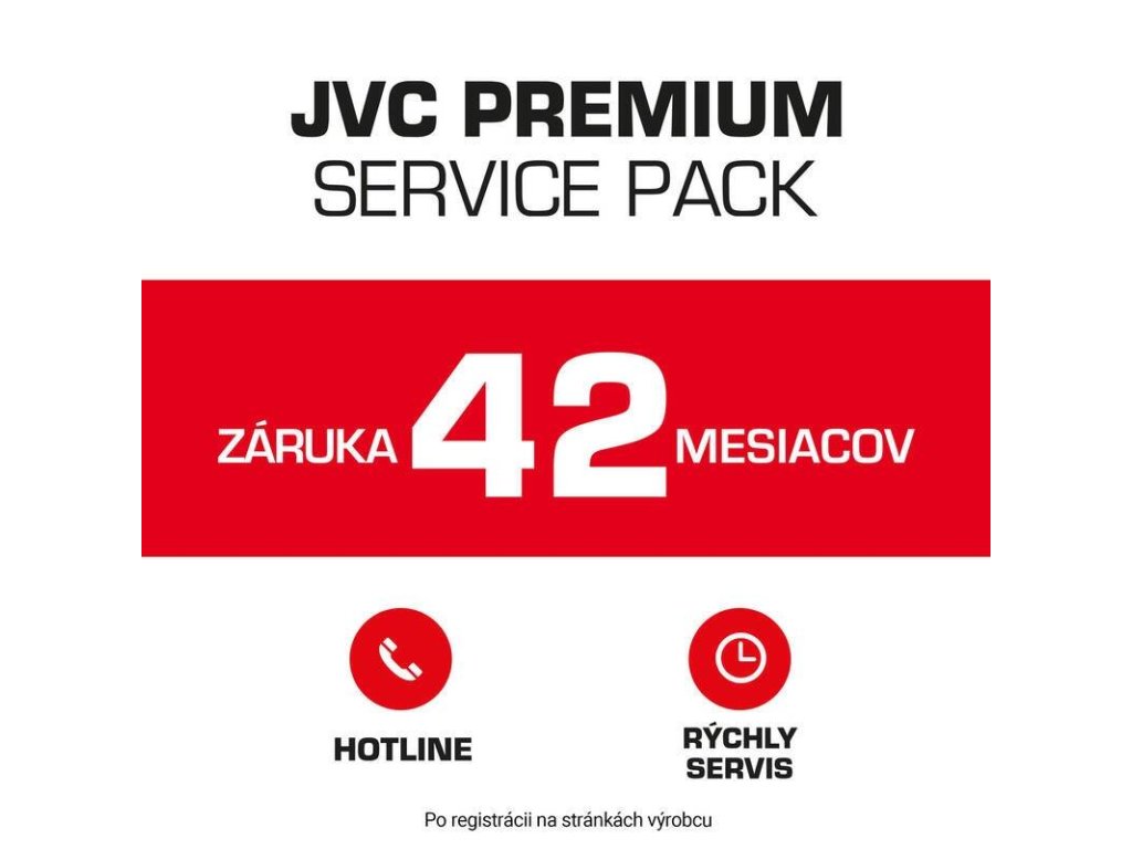 Značka JVC ponúka prémiový balíček plný výhod JVC PREMIUM SERVICE PACK. Na zakúpený televízor získate predĺženú záruku v dĺžke 42 mesiacov od nákupu. Na získanie prémiového balíčka sa stačí zaregistrovať do 30 dní od zakúpenia na webových stránkach značky. Predĺžená záruka 42 mesiacov sa riadi pravidlami výrobcu, ktoré nájdete na webe JVC.