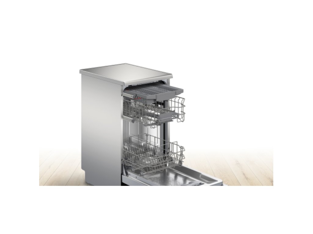 - Rackmatic: výškovo nastaviteľný horný kôš do umývačky pre väčšiu flexibilitu uloženia riadu.