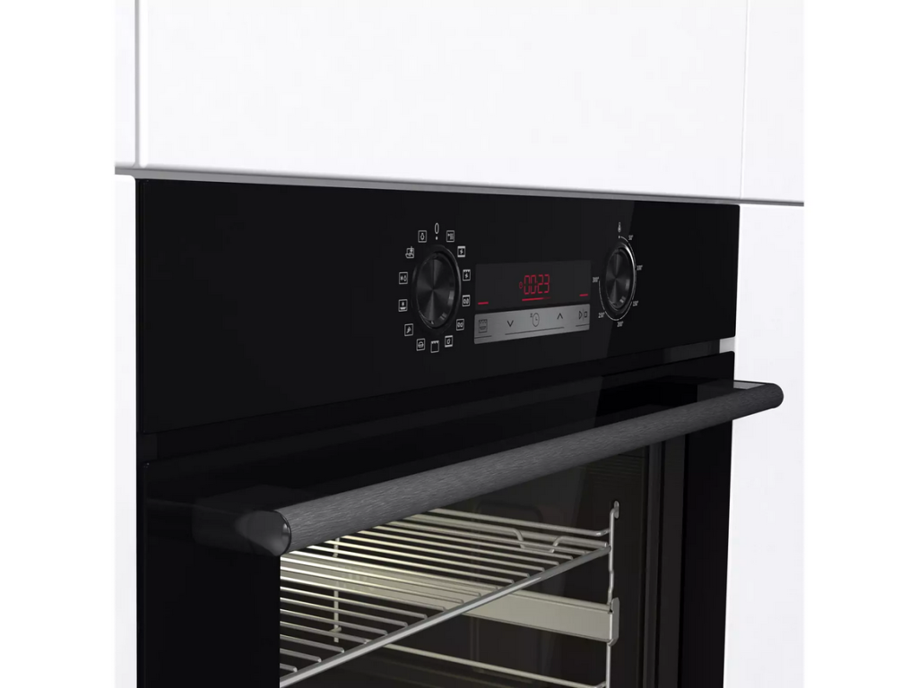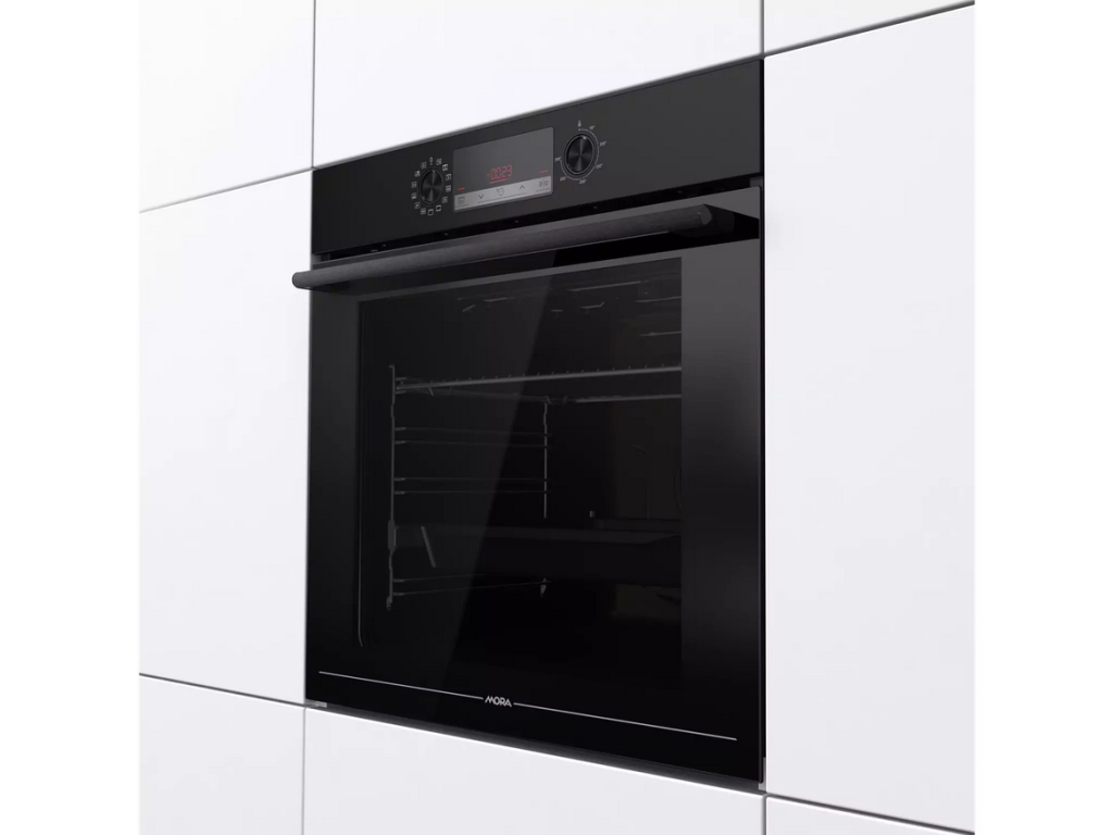 Táto elektrická rúra v elegantnom prevedení z čierneho skla vám okrem tradičného pečenia otvorí dvere k ďalším moderným tepelným úpravám pokrmu. Disponuje funkciou pary, ktorú ocenia predovšetkým priaznivci zdravej výživy. Pripravíte s ňou jedlá rýchlo a šetrne, takže si zachovajú maximum vitamínov a stopových prvkov. Navyše vás prekvapí výborná chuť a prirodzená konzistencia výsledných jedál. Pokiaľ si radi pochutnávate na hranolkách alebo kuracích nugetách, ale nedoprajete si ich tak často kvôli vysokej kalorickej hodnote, môžete tiež skúsiť program pre teplovzdušné fritovanie bez tuku. Ďalej je rúra vybavená 12 programami pečenia, ktoré sú navrhnuté presne podľa potrieb konkrétnych jedál. Vykúzlite napríklad výbornú pizzu ako z talianskej reštaurácie (program Pizza 300 °C), pomaly upečiete pečienku a efektívne rozmrazíte hotové porcie jedla. Klenutý vnútorný priestor rúry je inšpirovaný tradičným tvarom kamennej pece. Chytro rozmiestnené vyhrievacie telesá a extra veľký objem 77 l zaručujú dokonale prepečené a chrumkavé jedlo zo všetkých strán. Túto vlastnosť oceníte najmä pri príprave hydiny alebo domáceho chleba. Zaujme vás určite aj variabilným rozpätím teploty od 50 do 300 °C. Teleskopický výsuv zabezpečí ľahšiu manipuláciu s plechom, zatiaľ čo tiché zatváranie a otváranie dvierok prinesie komfort pri každodennej prevádzke. Perfektné vyčistenie parou zaistí funkcia ECO CLEAN, vďaka ktorej odstránite aj väčšie nečistoty bez nutnosti použiť čistiaci prostriedok. Rúra spadá do ekologickej triedy A.